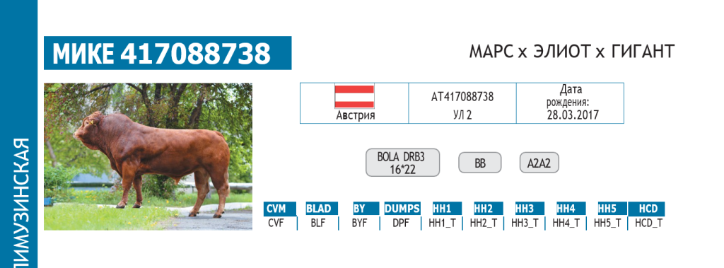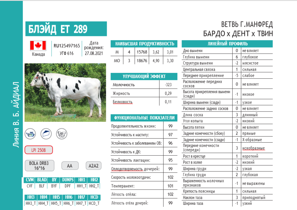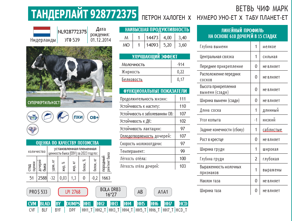Наша цель – увеличение Вашей прибыли! Увеличение молочной продуктивности в хозяйствах-партнерах за предыдущие 5 лет на 450 кг молока ежегодно (в среднем). МДЖ до 5%, МДБ до 3.45%. За 2023 год оценено 186 быков-производителей, на оценке в 2024 году 21. Геномный прогноз племенной ценности: Индекс TPI –2500-3200 Улучшающий эффект — по продуктивности : + 1981 по жирномолочности : + 0,54% по белковомолочности : +0,32% Экономический индекс NM – 500-700: 3248 Положительный геномный прогноз по функциональным и экстерьерным признакам.