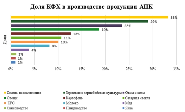 «На долю фермеров приходится значительная часть объема сельхозпродукции. Так, в производстве семян подсолнечника КФХ принадлежит 33%: фактически каждая третья бутылка масла содержит в себе плоды труда многочисленных представителей малого бизнеса. Наличие хлеба на столе тоже немыслимо без участия фермеров. Ведь в объеме зерновых и зернобобовых (пшеница, рожь, гречиха, рис, горох и т.д.) КФХ принадлежит целых 29%. В целом значительна доля фермеров и в производстве других продуктов растениеводства: овощей (19%), картофеля (13%), сахарной свеклы (11%)», – рассказал заместитель руководителя Центра отраслевой экспертизы Россельхозбанка Дмитрий Жиляков.