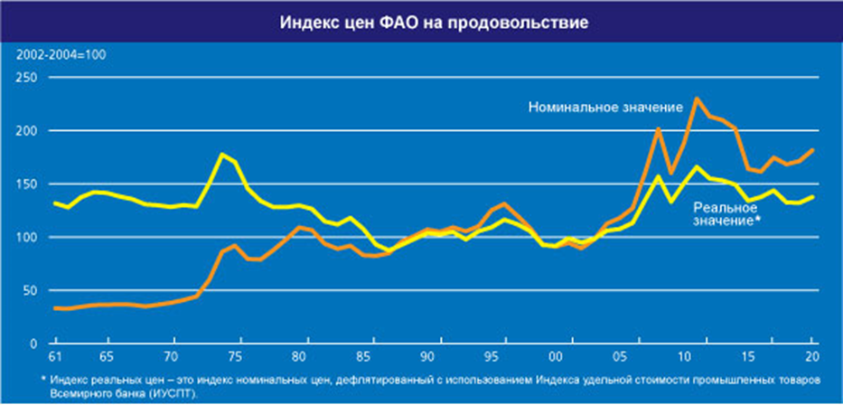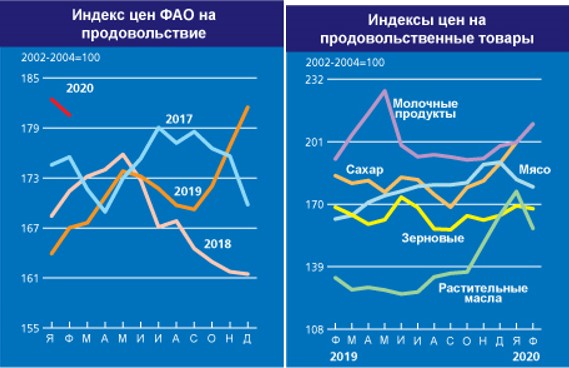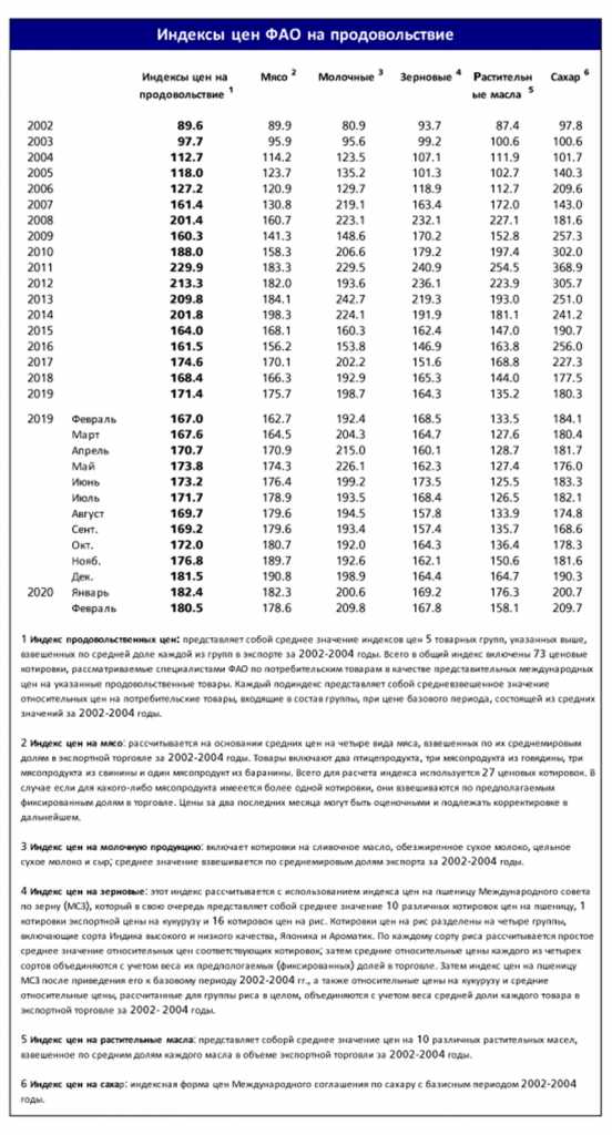 » Среднее значение Индекса продовольственных цен ФАО* (ИПЦФ) в феврале 2020 года составило 180,5 пункта, что на 1,9 пункта (1,0 процента) ниже по сравнению с январским показателем и на 13,5 пункта (8,1 процента) выше по сравнению с уровнем февраля 2019 года. Таким образом, в феврале было зафиксировано первое снижение значения ИПЦФ после четырехмесячного роста. Причиной снижения стало резкое падение экспортных цен на растительные масла и, в чуть меньшей степени – на мясо и зерно, на фоне продолжающегося роста цен на молочную продукцию и сахар.