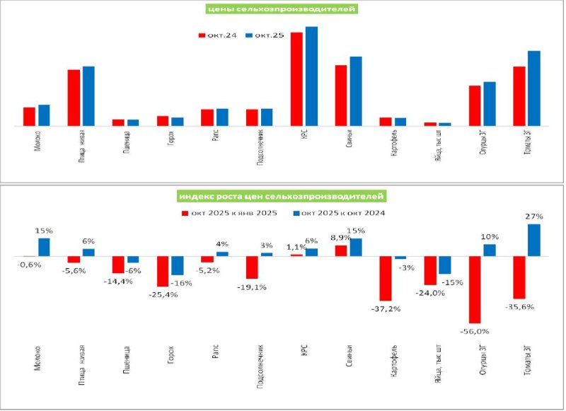 По сравнению с октябрем прошлого года цены подросли, но не на все продукты. Снизились цены на пшеницу, горох, картофель и яйца. При этом по сравнению с началом 2025 года рост цен отмечен в основном в продукции животноводства (кроме яиц), рапса и подсолнечника. Однако и этот рост цен ниже уровня инфляции. При этом по масличным культурам и гороху основное падение закупочных цен впереди на фоне неизбежного роста предложения.