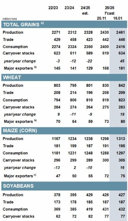 Мировой объем производства зерна достигнет рекордных 2,461 миллиарда тонн (рост на 31 миллион тонн по сравнению с ноябрьским прогнозом), одновременно повысив оценку переходящих запасов на 15 миллионов тонн до 634 миллионов тонн, что является самым высоким уровнем за девять лет.