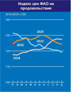 Среднее значение Индекса продовольственных цен ФАО снижается пятый месяц подряд. В январе 2026 года его значение было на 0,4% ниже показателя декабря, и на целых 22,7% ниже пикового уровня, зафиксированного в марте 2022 года.
