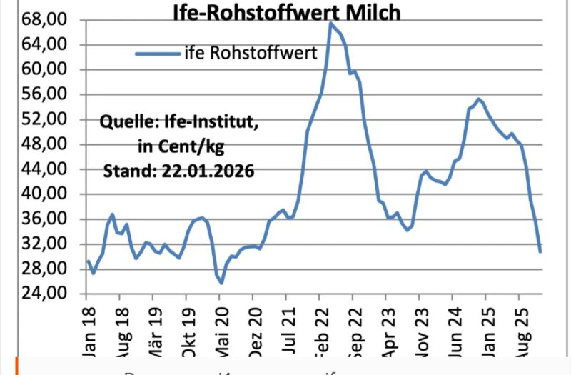 В Германии еще в декабре молочные заводы снова резко снизили цены на молоко. Во всех регионах молочные фермы теперь платят молочным фермерам значительно меньше молочных продуктов, чем в ноябре, и примерно на 12-13 евроцентов меньше, чем год назад. При этом цены на молоко на большинстве молочных заводов сейчас значительно ниже 40 евроцентов за литр. Тем не менее, в ближайшие несколько месяцев цены на молоко будут продолжать падать, поскольку экономическое использование молока (стоимость сырья) и цены выплат молочным фермерам по-прежнему сильно различаются. По основным рыночным показателям: например, товарная стоимость молока и биржевая стоимость молока по-прежнему намного ниже розничных цен на молочные продукты, а спотовые цены на молоко такие низкие, каких не было целую вечность.