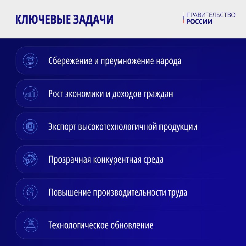 6️⃣Обеспечить постоянное технологическое обновление, создавать условия для появления в стране инноваций и их активного применения на практике в ключевых отраслях. Как отметил глава Правительства, именно это сегодня является …