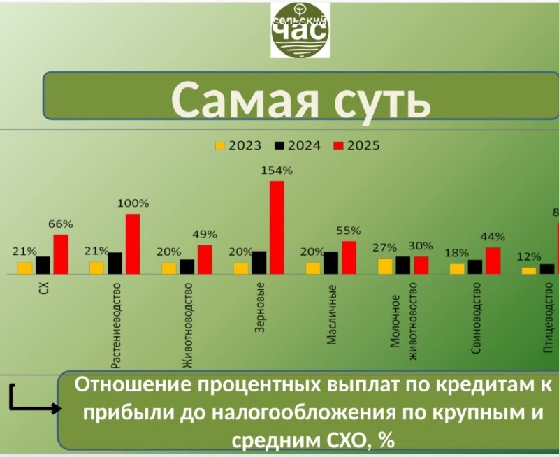 В экономике считается, что критическая точка отношения процентных платежей по кредитам к прибыли составляет 30%. По сельскому хозяйству в 2025 году она вышла за все разумные пределы и составила 66%, а по растениеводству – 100%!