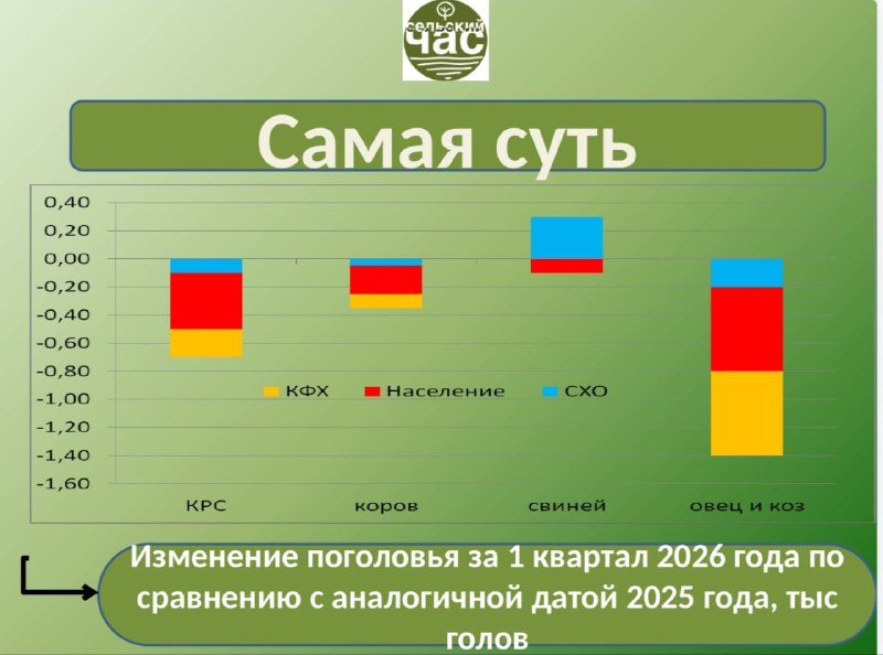 Тренд на сокращение поголовья КРС, коров, а также овец и коз сохранился в текущем году. При этом если в СХО темпы снижения поголовья в первом квартале замедлились, то в хозяйствах населения и КФХ продолжается ускоренное падение. По данным Росстата на 1 апреля 2026 года по сравнению с аналогичной датой прошлого года поголовье КРС сократилось на 0,6 млн голов, в том числе коров — на 0,3 млн голов. Несколько подросло поголовье свиней: плюс 0,3 млн голов в СХО, но минус 0,1 млн голов в хозяйствах населения. Хорошо подросло поголовье птицы — на 4,9 млн голов в СХО, но одновременно на 4,7 млн голов оно сократилось в КФХ и хозяйствах населения.