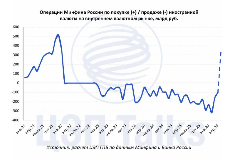 Валютные интервенции были приостановлены с марта 2026 г. Величина отложенных продаж валюты марта соотносится с отложенными покупками валюты апреля – за эти два месяца, когда валютные интервенции не проводились, возможен неттинг операций. Однако в мае ожидаем перехода к чистым покупкам валюты, впервые с 2021 г.