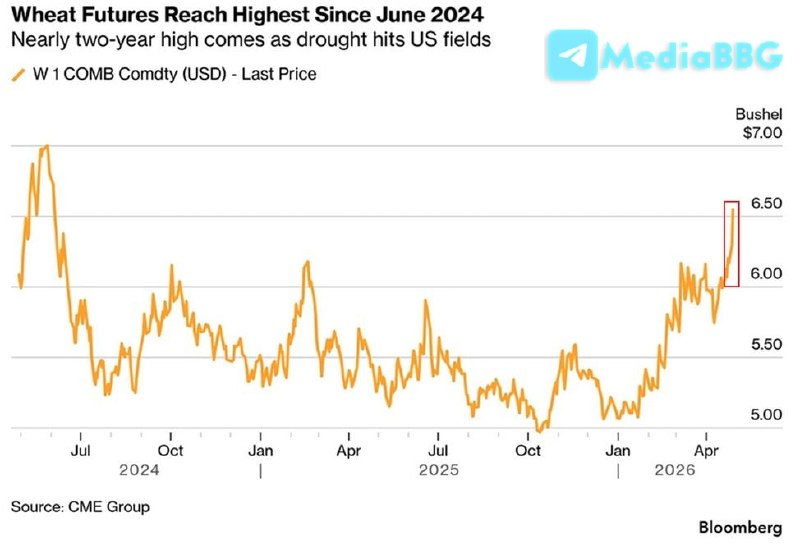 Фьючерсы на пшеницу в США во вторник выросли на +4,1% — до примерно 6,58 доллара за бушель, что является максимальным уровнем с июня 2024 года.