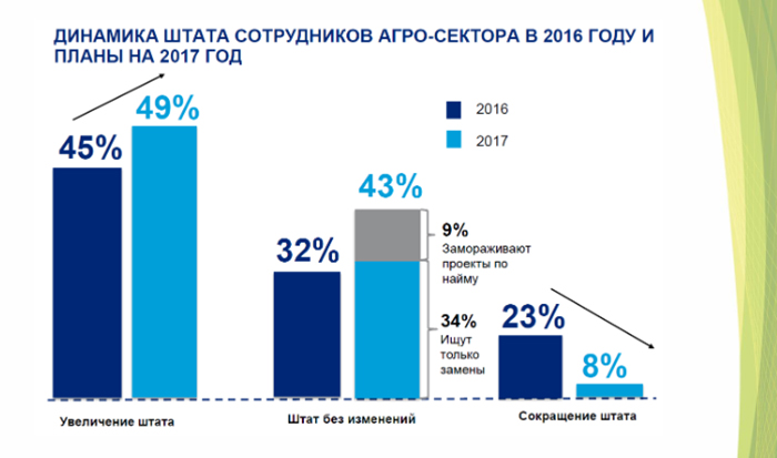 При этом если посмотреть на последнее исследование британской компании Hays в России именно квалифицированный персонал является для сельского хозяйства одной из самых острых проблем на фоне общего роста отрасли.
