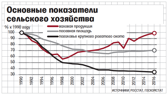 Потери посевных составили около 40 млн га от 119 млн га в 1990 г., т. е. почти треть. Но связаны они были не только с общеэкономическим кризисом, но и с тем, что на значительной части территории, где природные и демографические условия не благоприятствовали развитию сельского хозяйства, без огромных советских дотаций колхозы выжить не могли. Тем более что в советское время многие предприятия под контролем партийных органов вынуждены были распахивать больше земель, чем реально могли обработать.