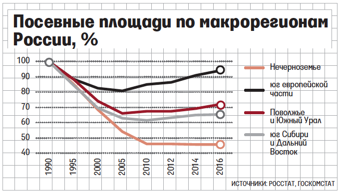 Наиболее сильное сокращение характерно для нечерноземных регионов (13 млн га), откуда население массово уезжало в советское время и продолжает уезжать сейчас. С учетом природных и социальных ограничений здесь не более трети пахотных земель, в основном не очень сильно удаленных от больших городов, может быть возвращено в оборот. Не менее сильные потери произошли в степных районах Поволжья и Урала. Частичное их восстановление облегчено безлесностью территории, востребованностью зерна и может опираться на еще не растраченный потенциал местного населения. Главным становится поиск баланса между пахотным и пастбищным использованием земель, учитывая экологические последствия сильной распашки в засушливых районах и необходимость развития пастбищного мясного животноводства. На юге европейской части России потери невелики и идет активное восстановление посевных площадей при резком увеличении доли зерновых культур, в том числе с нарушением севооборотов и истощением земель. А восточные регионы, потерявшие почти 10 млн га посевов, как и Нечерноземье, продолжают терять и население, хотя и там на юге Западной Сибири существует значительный потенциал производства зерновых. И все же значительное сокращение былой посевной площади России неизбежно, ведь дело не в количестве земель, а в рациональности и эффективности их использования.